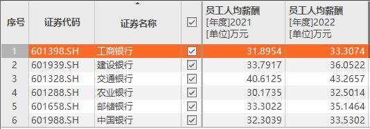 2022年,中国银行和工商银行员工人均薪酬分别为33.5万元和33.3万元,较同期微涨1.2万元和1.4万元。农业银行人均薪酬较同期增长7.6%,目前达到人均32.5万元。