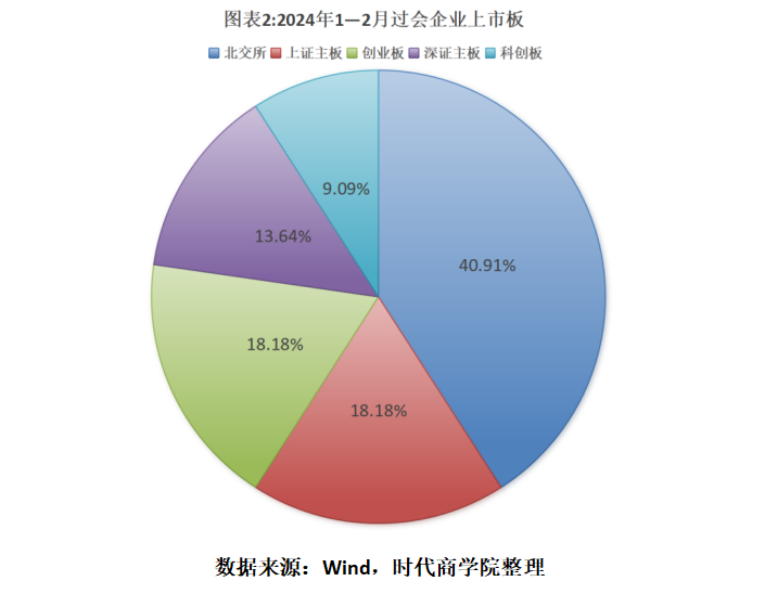 从上市板块来看,今年1—2月,过会的22家企业中,有9家企业来自北交所,占比达到40.91%,远高于去年同期的23.91%。