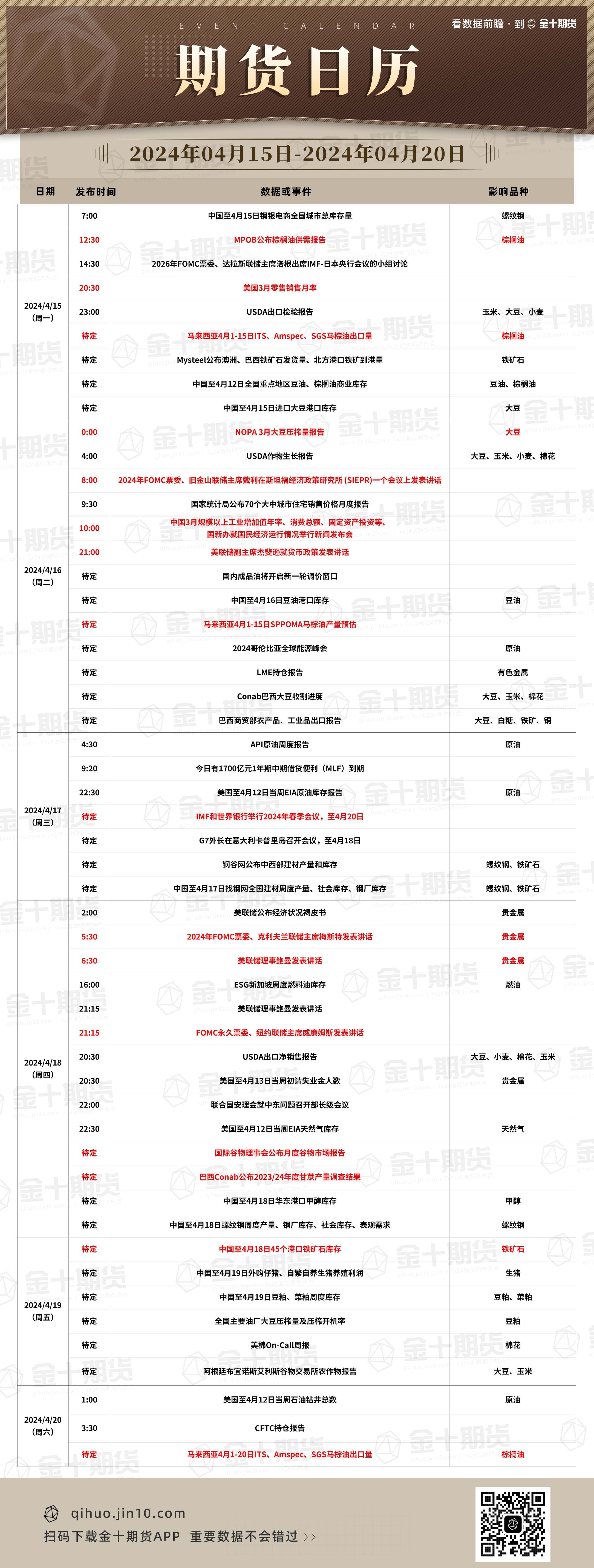2. 4月15日待定,ITS/Amspec/SGS将公布4月1-15日马来西亚棕榈油出口量。机构预计马棕油4月前15天的出口依然强劲,但增幅可能会有所减弱。
