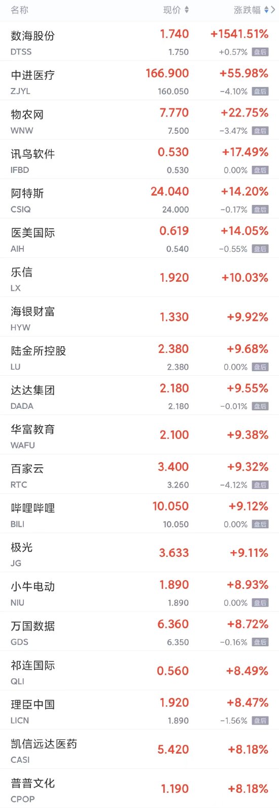 中進醫療漲超55%,物農網漲超22%,訊鳥軟件漲超17%,阿特斯,醫美國際漲超14%,樂信漲超10%,海銀財富,陸金所控股,達達集團,華富教育,百家雲,嗶哩嗶哩,極光等漲超9%,小牛電動,萬國數據,祁連國際,理臣中國,凱信遠達醫藥,普普文化,金生遊樂,UT斯達康等漲超8%。