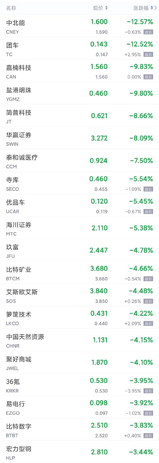 中北能,團車跌超12%,嘉楠科技,鹽港明珠跌超9%,簡普科技,華贏證券跌超8%,泰和誠醫療跌超7%,寺庫,優品車,海川證券跌超5%,玖富,比特礦業,艾斯歐艾斯,籮筐技術,中國天然資源,聚好商城等跌超4%。