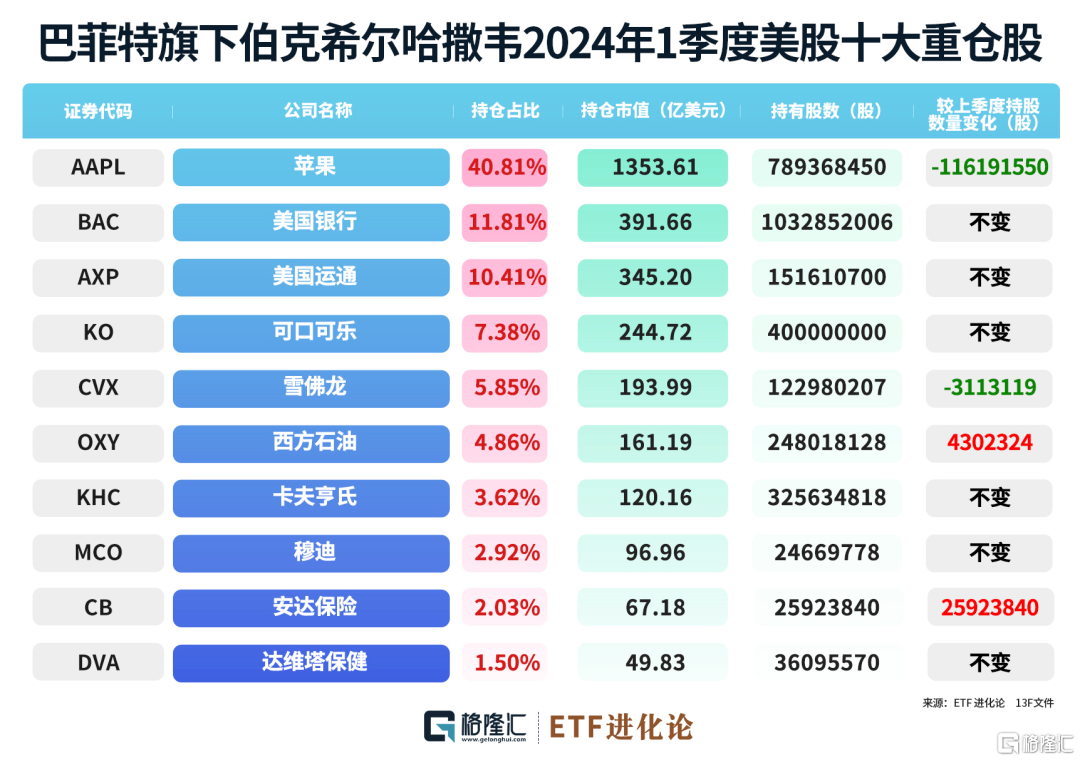 其中第一權重股蘋果一季度被伯克希爾減持的數量最大,高達1.16億股,持股數量環比下降13%。