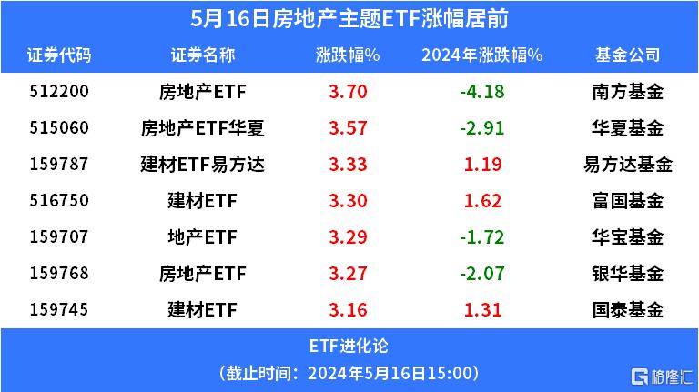 房地產主題ETF強勢霸屏漲幅榜,南方基金房地產ETF、房地產ETF華夏均漲超3%,建材ETF易方達、富國基金建材ETF也漲超3%。