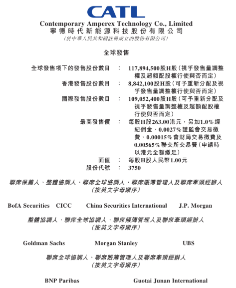 宁德时代(03750.HK)发布公告,公司拟全球发售约1.18亿股H股(视乎发售量调整权及超额配股权行使与否而定),中国香港发售股份884.21万股,国际发售股份约1.09亿股;2025年5月12日至5月15日招股,预期定价期间为5月13日至5月16日;发售价将不高于263.00港元,每手买卖单位为100股,BofA Securities、CICC、 China Securities International、及J.P. Morgan为联席保荐人;预期股份将于2025年5月20日开始在联交所买卖。