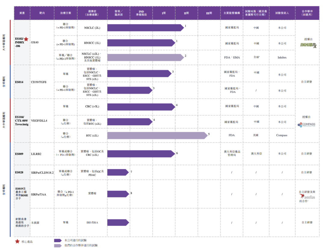 公司的创新管线包括六个主要资产,其中四项处于临床阶段,两项处于临床前阶段。公司的核心产品是ES102,也是临床上先进的六价OX40激活剂抗体,ES102专用于治疗对ICI反应不佳的癌症患者。(ICI:免疫检查点抑制剂,一种免疫疗法)。