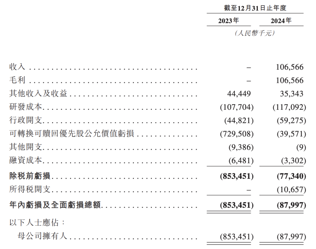 公司2023年未有收入、毛利,2024年产生收入1.07亿,主要来自于公司与安斯泰来的合作、期权及许可协议,净亏损有所收窄。