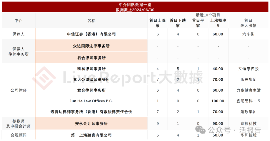 据LiveReport大数据统计,科望医药中介团队共计10家,其中独家保荐人1家,近期保荐项目数据一般;公司律师共计5家,综合项目数据较好。整体而言中介团队历史数据表现一般。