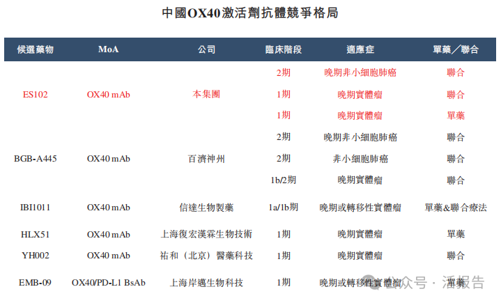 截至最后实际可行日期,全球并无获批准的OX40激活剂抗体。在中国,截至同日有六种OX40激活剂候选抗体正在进行临床开发,其中最先进的候选抗体为ES102,目前处于2期临床试验阶段。在该等候选药物中,许多正在开发为与化疗或单抗的联合疗法。