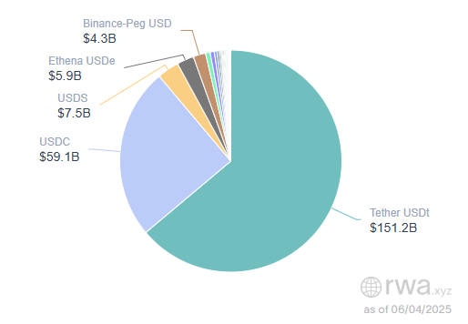 Circle是全球第二大稳定币USDC(仅次于USDT)和最大欧元稳定币EURC的发行商,用户可使用USDC进行支付、结算和作为数字美元价值存储。截至2025年3月28日,USDC的流通量高达600亿美元。 据rwa.xyz的数据,目前全球稳定币资产总市值接近2400亿美元,其中USDT市值超过1500亿美元,占比约64%;USDC市值约600亿美元,占比约25%,两者合计占比接近90%。