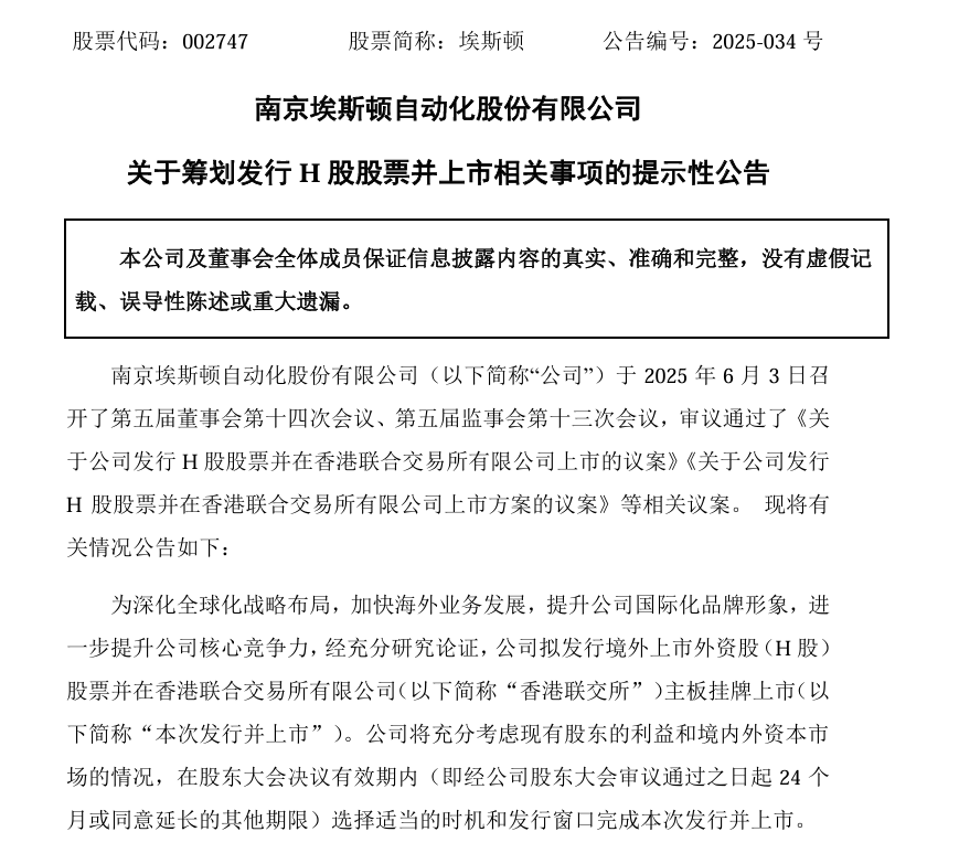 6月4日,来自南京的公司埃斯顿(002747.SZ)发布公告称,为深化全球化战略布局,加快海外业务发展,提升公司国际化品牌形象,进一步提升公司核心竞争力,经充分研究论证,公司拟发行H股股票并在港交所主板上市。