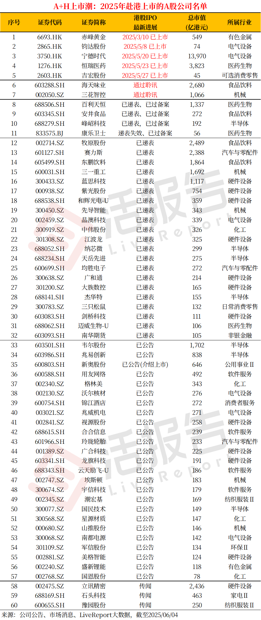 据LiveReport大数据统计,截至6月4日,今年已有赤峰黄金(6693.HK)、钧达股份(2865.HK)、宁德时代(3750.HK)、恒瑞医药(1276.HK)及吉宏股份(2603.HK)登陆港交所,实现AH上市;2家通过聆讯,为海天味业和三花智控。此外,还有53家公司拟“A+H”上市,其中21家已递表,25家已发公告,3家传闻上市,AH上市浪潮势不可挡。