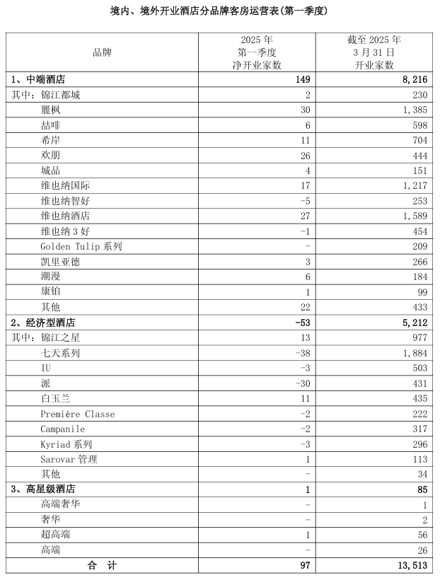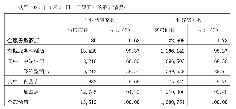 截至2025年3月31日,已经开业的酒店合计达到13,513家,已经开业的酒店客房总数达到1,308,751间。