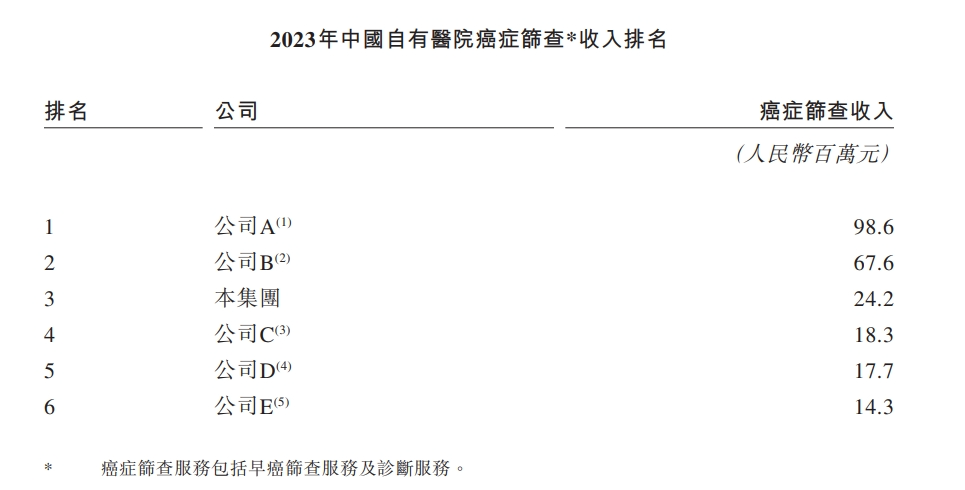 在中国所有民营肿瘤医疗集团中,按2023年癌症筛查收入计,公司排名第三。