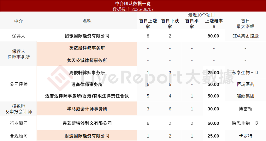 据LiveReport大数据统计,佰泽医疗中介团队共计9家,其中保荐人1家,近10家保荐项目数据表现还不错;公司律师共计3家,综合项目数据表现普通。整体而言中介团队历史数据不尽人意。