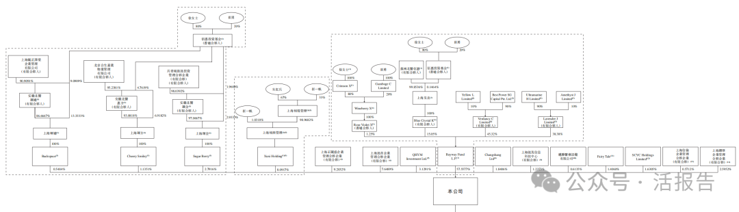 徐旭女士通过Bayway Fund L.P.持股57.56%;朱红兵及其儿子崔一帆通过Xuxi Holding持股8.09%;百惠投资基金(徐女士80%、崔勇20%)通过Backspace、Cheery Smiley、Sugar Berry分别持股0.55%、1.14%、2.79%;