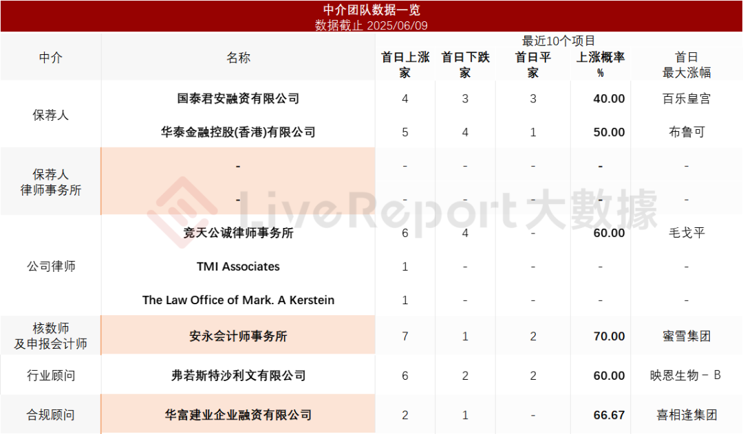 据LiveReport大数据统计,卧安机器人中介团队共计8家,其中保荐人2家,近10家保荐项目数据表现不足;公司律师3家,综合项目数据尚可。整体而言中介团队历史数据表现一般。