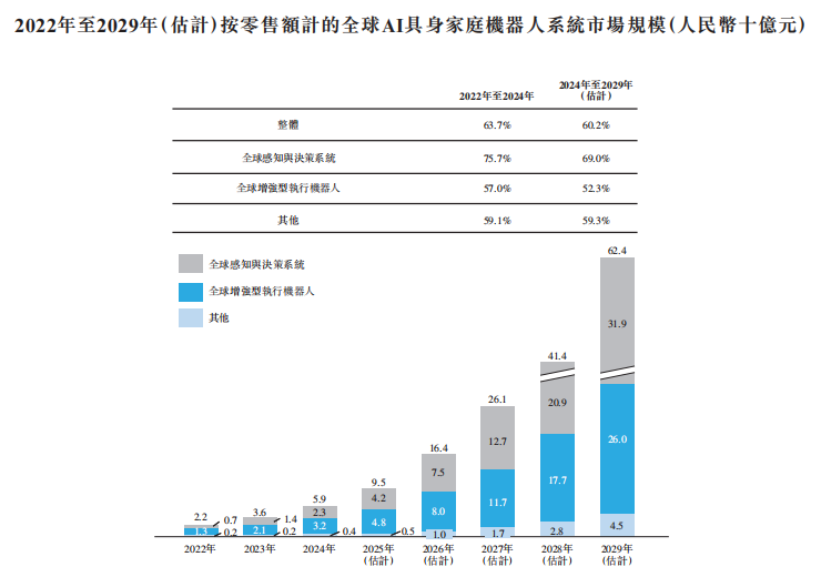 AI具身家庭机器人系统行业经历快速增长。按零售额计,全球AI具身家庭机器人系统行业的市场规模从2022年的人民币22亿元增长至2024年的人民币59亿元,期内复合年增长率约为63.7%。