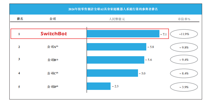根据弗若斯特沙利文报告,按2024年的零售额计算,公司是全球最大的AI具身家庭机器人系统提供商,市场份额为11.9%,亦为唯一一家在家庭生活场景全面布局家庭机器人品类的AI具身家庭机器人系统提供商。