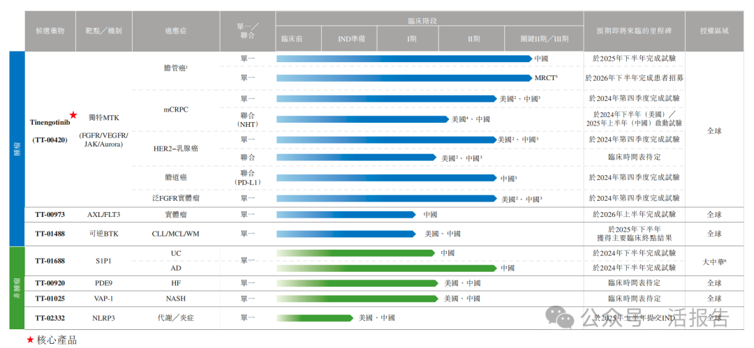 凭借本身全面融合的内部研发系统,公司已建立六款临床阶段候选产品及一款临床前阶段候选产品的管线。公司的核心产品Tinengotinib(TT-00420)是一款有潜力成为全球首创药物、处于注册阶段、自主研发的独特多靶点激酶(“MTK”)抑制剂(主要靶向三个关键通路(即FGFR/VEGFR、JAK和Aurora激酶))。