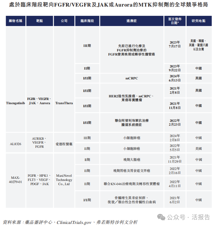 截至最后实际可行日期,一款靶向FGFR的MTK抑制剂(即厄达替尼)获得FDA批准。截至最后实际可行日期,全球有三款处于临床阶段的靶向FGFR以及JAK、Aurora及VEGFR中一种或以上的MTK抑制剂。Tinengotinib为一款独特的靶向FGFR/VEGFR、JAK及Aurora的MTK抑制剂,使其能有效治疗胆管癌、mCRPC及HR+/HER2-乳腺癌。