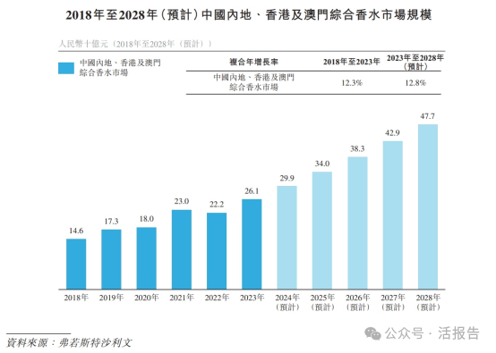 根据弗若斯特沙利文的资料,“颖通控股”主要业务所在的中国内地、香港及澳门香水零售市场规模由2018年的人民币146亿元增加至2023年的人民币261亿元,复合年增长率约为12.3%,预计2028年将进一步增长至人民币477亿元,2023年至2028年复合年增长率约为12.8%。