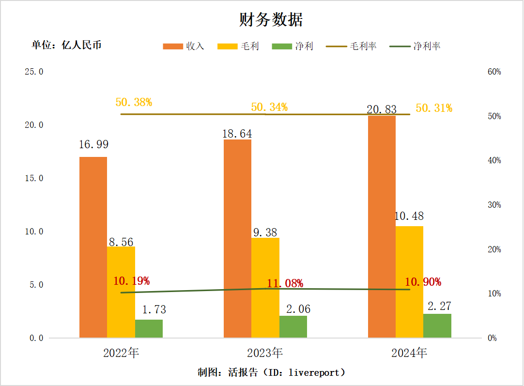 公司是中国内地及港澳综合市场领先的香水品牌管理公司,2024财年收入为人民币20.83亿元,净利润2.27亿元,毛利率50.31%。
