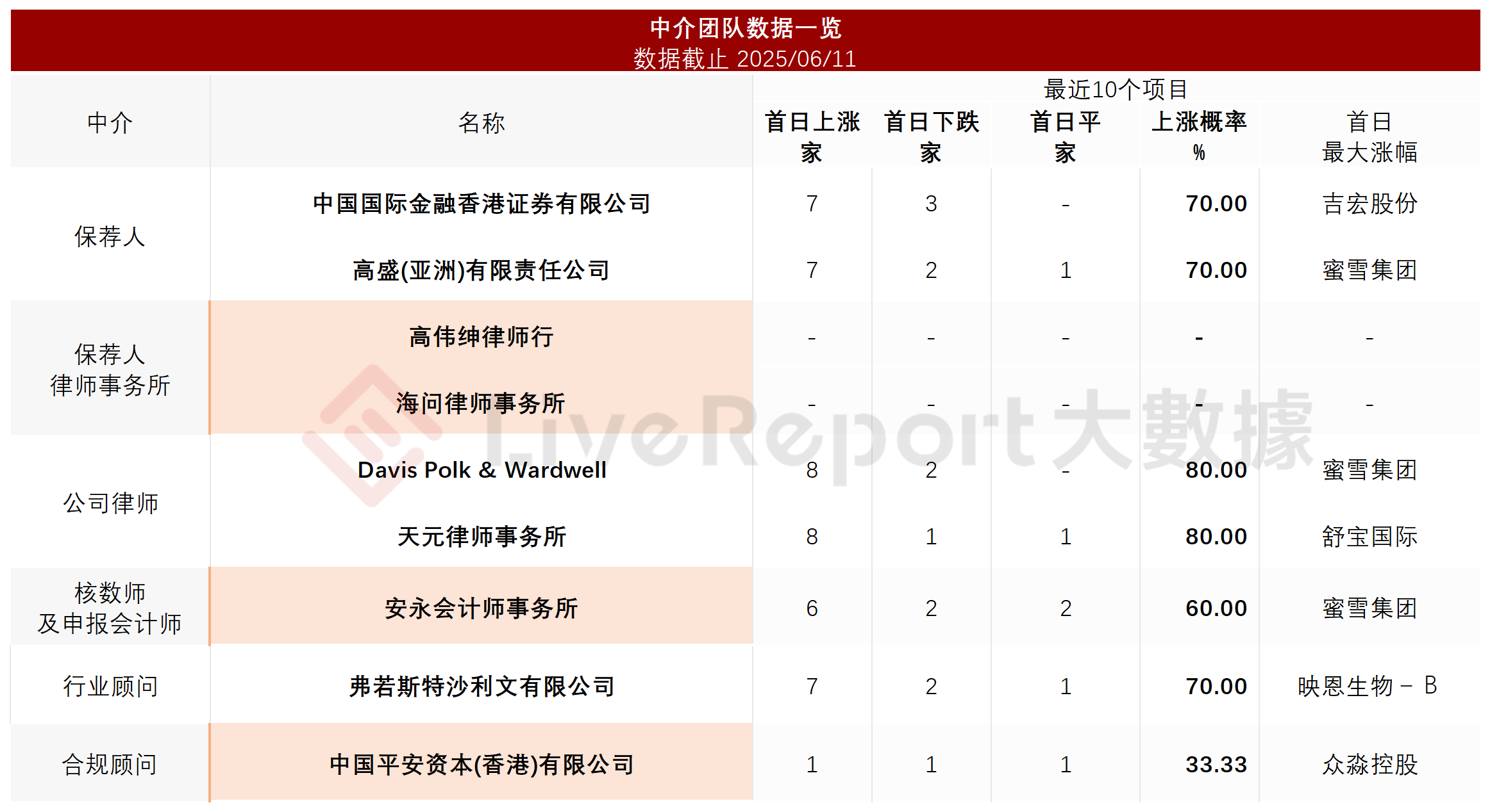 据LiveReport大数据统计,安井食品中介团队共计9家,其中保荐人2家,近10家保荐项目数据表现尚可;公司律师2家,综合项目数据整体不错。整体而言中介团队历史数据表现有一定优势。