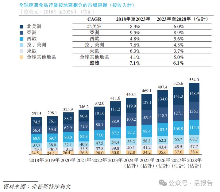 根据弗若斯特沙利文数据,2018年至2023年,全球速冻食品行业的市场规模以7.1%的CAGR增长,2023年达4,116亿美元。2023年至2028年,预计全球速冻食品行业CAGR达6.1%。北美、亚洲及西欧为全球速冻食品行业市场规模最大的地区。