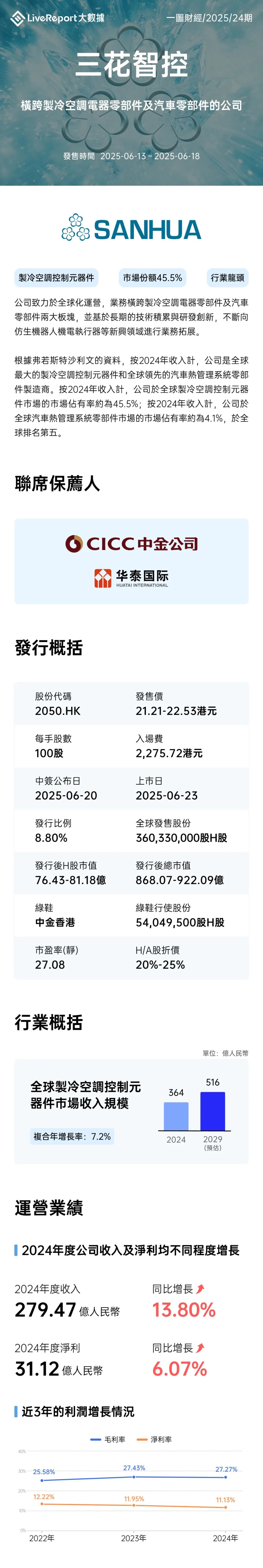三花智控(2050.HK)招股日期为2025年6月13日至2025年6月18日,并预计于2025年6月23日在港交所挂牌上市。