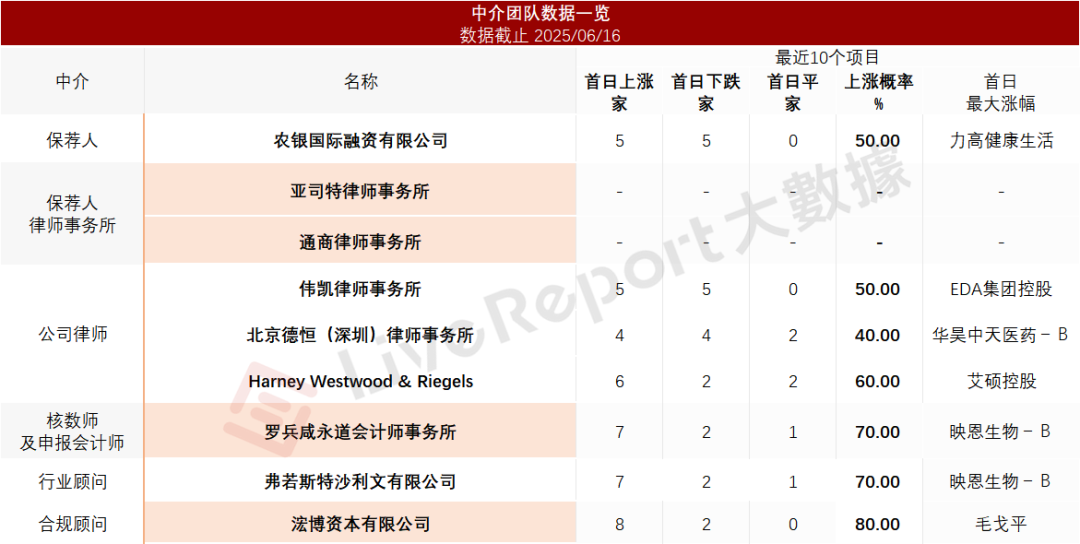 据LiveReport大数据统计,Hope Sea中介团队共计9家,其中保荐人1家,近10家保荐项目数据表现欠佳;公司律师共计3家,综合项目数据表现平平。整体而言中介团队历史数据表现一般。