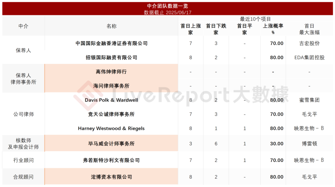 据LiveReport大数据统计,巴奴国际中介团队共计10家,其中保荐人2家,近10家保荐项目数据表现不错;公司律师3家,综合项目数据整体不错。整体而言中介团队历史数据表现还可以。