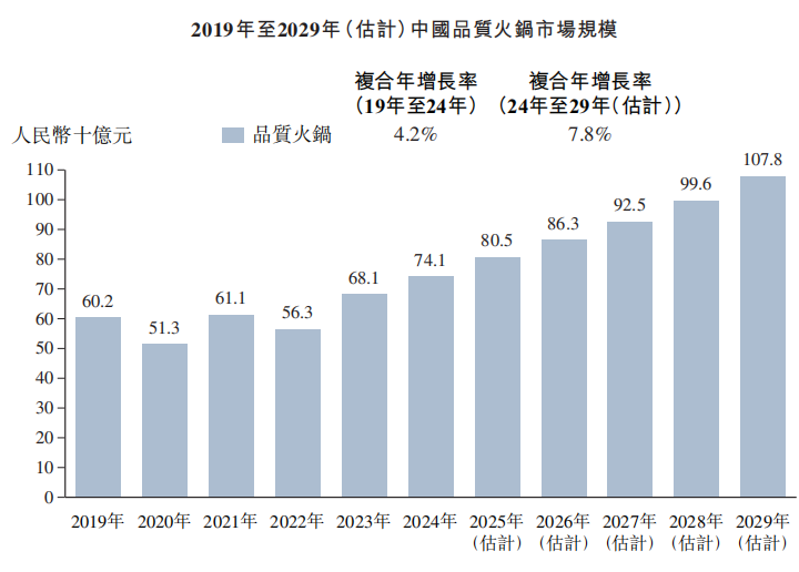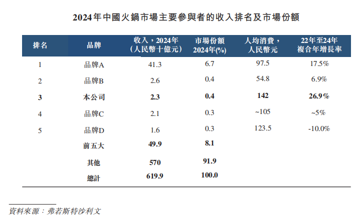 根据弗若斯特沙利文的资料,中国的火锅市场相对分散,按2024年的收入计算,前五大参与者所占市场份额约为8.1%。按收入计,公司为中国火锅市场第三大品牌,于2024年占据0.4%的市场份额。此外,截至2024年底,公司拥有144家门店。