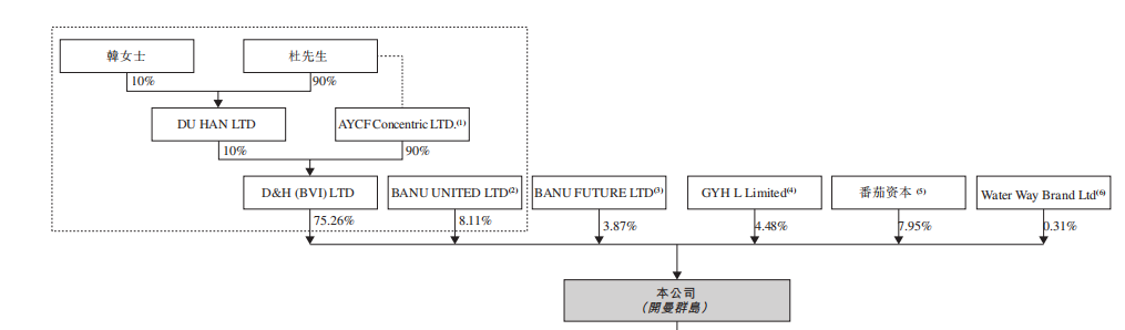 创始人夫妇杜中兵、韩艳丽通过D&H(BVI)持股75.26%,通过员工持股平台BANU UNITED持股8.11%,合计持股83.38%。