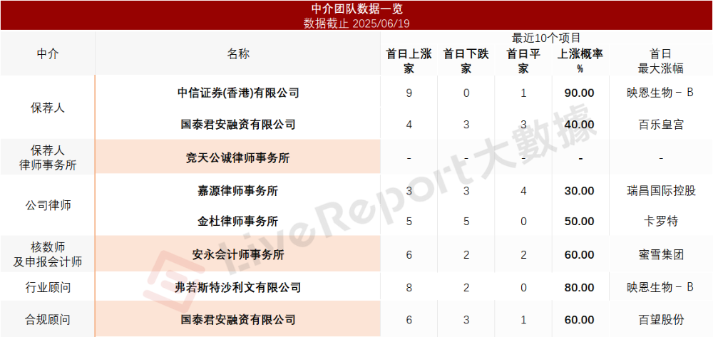 据LiveReport大数据统计,长光辰芯中介团队共计8家,其中保荐人2家,近10家保荐项目数据表现参差不齐;公司律师共计2家,综合项目数据表现欠佳。整体而言中介团队历史数据表现普通。