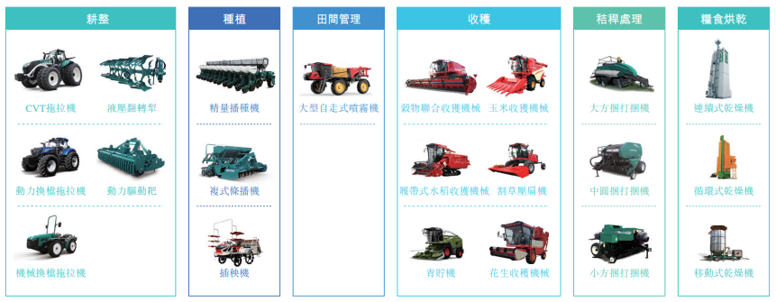 涵盖耕整、播种、田间管理、秸秆处理和粮食烘干等领域,为多种农机之间的协同作业效应奠定了坚实基础。核心产品包括高速精量播种机、复式条播机、高密度大方捆、自走式喷雾机、