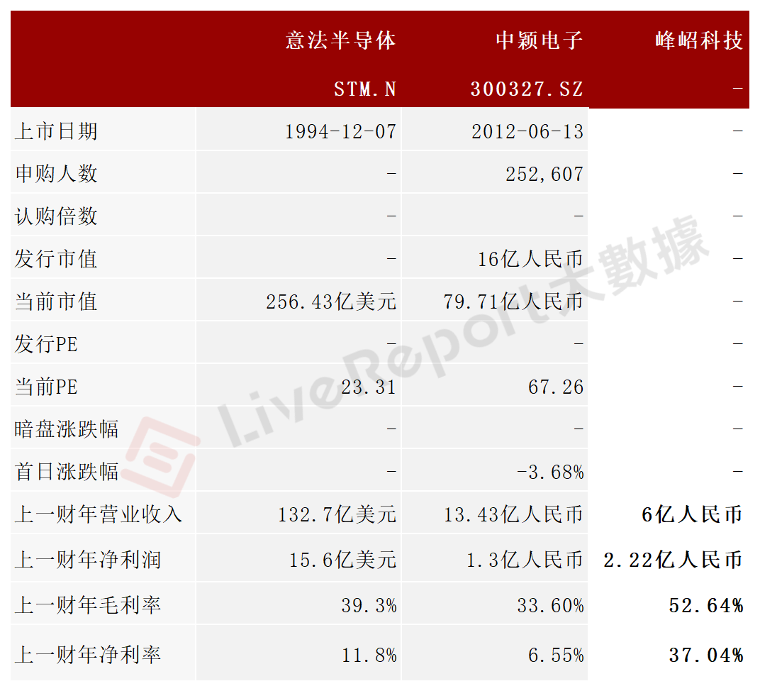 同行业IPO可比公司有:意法半导体(STM.US)、中颖电子(300327.SZ)