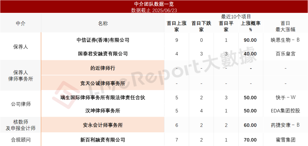 据LiveReport大数据统计,斯坦德机器人中介团队共计8家,其中保荐人2家,近10家保荐项目数据表现不一;公司律师共计2家,综合项目数据表现平平。整体而言中介团队历史数据表现一般。