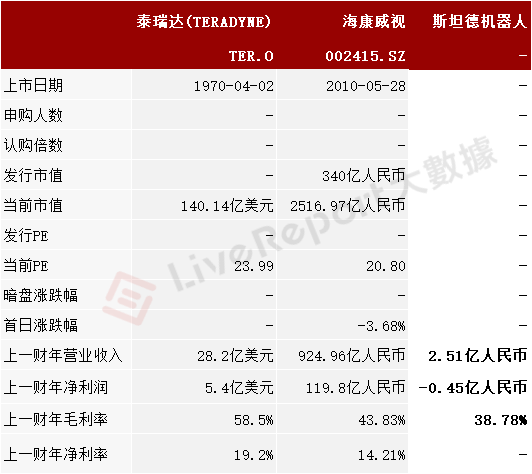 本次选取的同行业对比公司为:泰瑞达(TER.O)、海康威视(002415.SZ)
