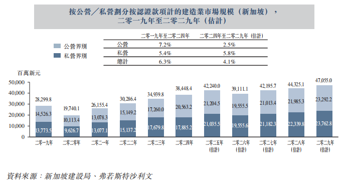 根据新加坡统计局和弗若斯特沙利文,新加坡建造业核证进度付款的总价值乃指全部已竣工工程及核证进度付款的总价值。该等数字自二零一九年至二零二四年呈显着增长,并预计将持续稳步增长至二零二九年。在持续的公营界别建筑需求(包括地铁线、公共房屋开发及医疗设施等基础设施项目)带动下,同时建筑工程因COVID-19疫情中断后逐步复苏,认证进度付款总额由二零一九年的28,299.8百万新元增加至二零二四年的38,448.4百万新元,期间的复合年增长率约为6.3%。