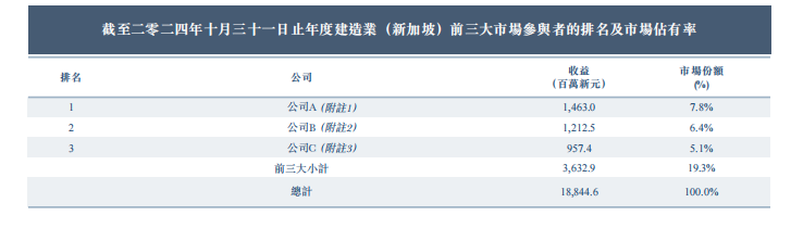 于二零二四年,新加坡建造业的前三大市场参与者占总市场份额的19.3%。公司在二零二四年占总市场的0.1%。