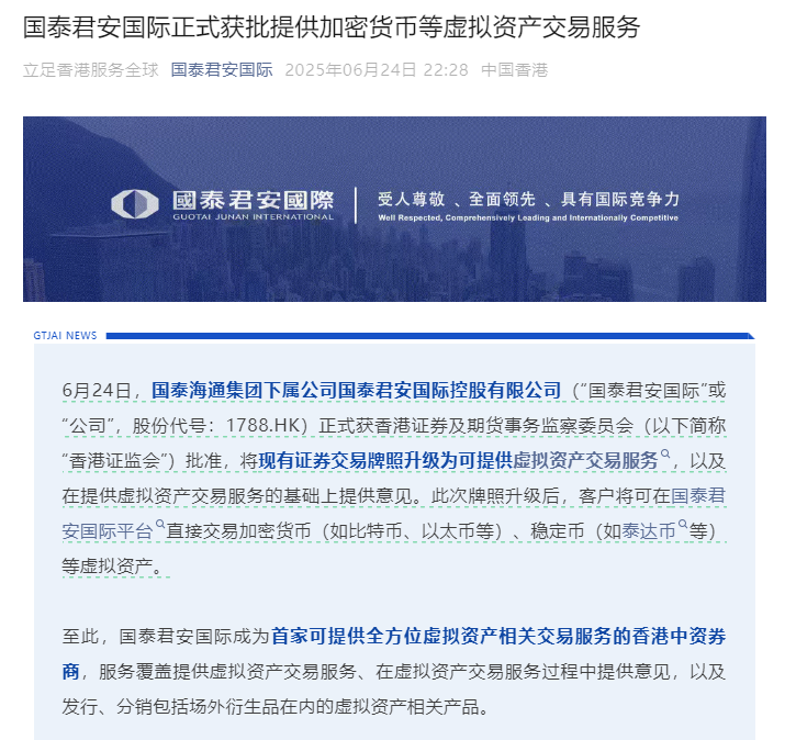 此次牌照升级后,客户将可在国泰君安国际平台直接交易加密货币(如
