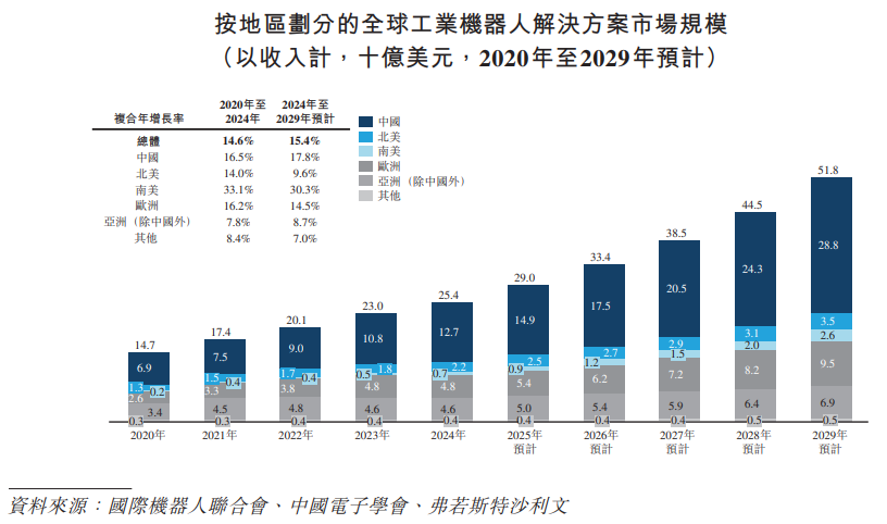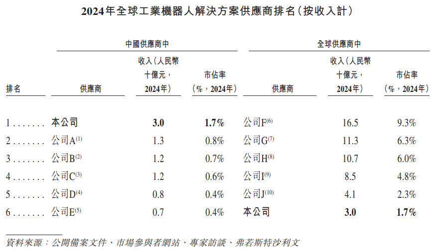 年收入计,公司于全球工业机器人解决方案市场在国内供货商中排名第一,于全球工业机器人解决方案市场在全球所有供货商中排名第六。