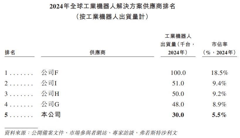 年工业机器人出货量计,公司于全球工业机器人解决方案市场在全球所有供货商中排名第五,市场份额为