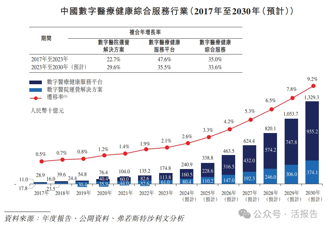根据弗若斯特沙利文的资料,中国数字医疗健康综合服务行业的市场规模从2017年的人民币289亿元增长到2023年的人民币1,748亿元,2017年至2023年的复合年增长率为35.0%,预计于2030年将达到人民币13,293亿元,2023年至2030年的复合年增长率为33.6%。