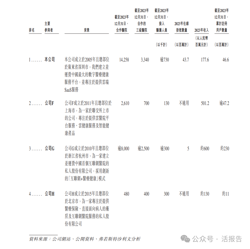于2023年,就以下方面而言,公司在这些主要参与者中排名第一:(i)2023年通过平台挂号的数量;(ii)截至2023年12月31日合作医院的数量;(iii)截至2023年12月31日合作的三级医院数量;及(iv)截至2023年12月31日接入平台的医护人员人数。此外,就以下方面而言,公司在中国该等主要参与者中排名第三:(i)2023年数字医疗健康解决方案产生的收入;及(ii)截至2023年12月31日的累计注册用户数。
