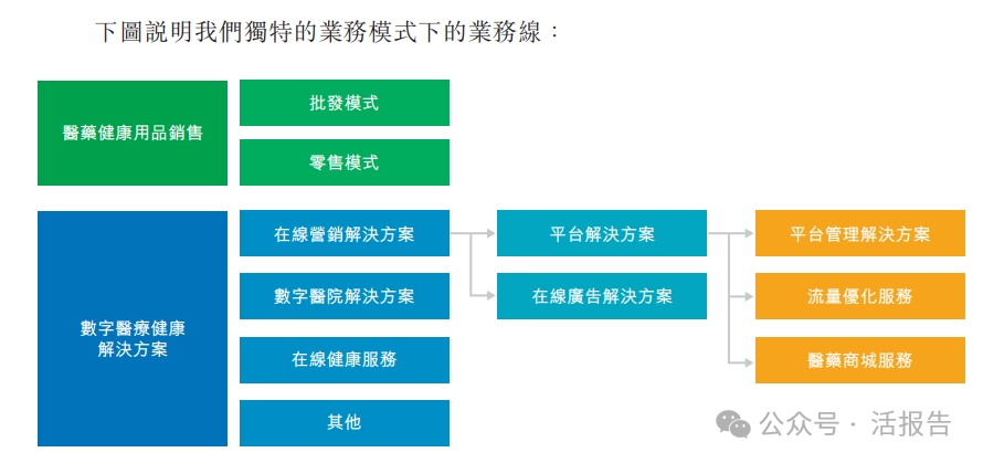 公司业务主要包括数字医疗健康解决方案和医药健康用品销售两块。数字医疗健康解决方案包括在线营销解决方案、数字医院解决方案、在线健康服务及其他业务;医药健康用品销售主要分为零售模式及批发模式。