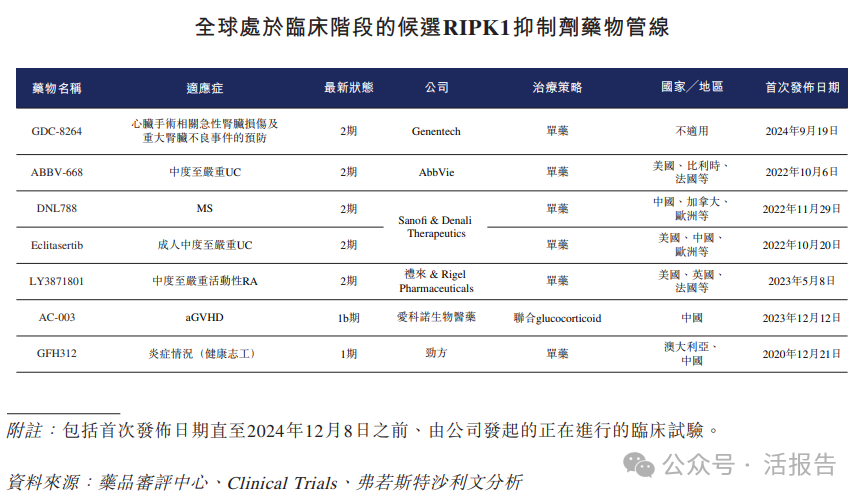 截至最后实际可行日期,全球尚未有获批准的RIPK1抑制剂药物。截至2024年12月8日,全球有七种RIPK1抑制剂候选药物正在进行临床开发,而GFH312是唯一一款用于治疗PAD和PBC的候选药物。