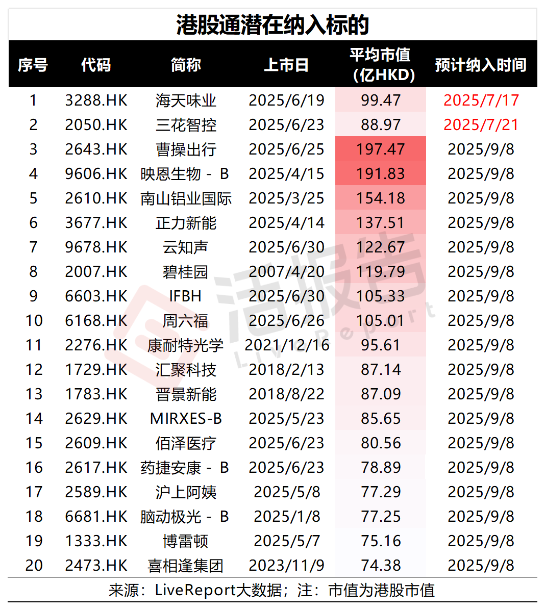 据LiveReport大数据预测,海天味业、三花智控为AH公司,稳价期结束后有望 直接纳入港股通。