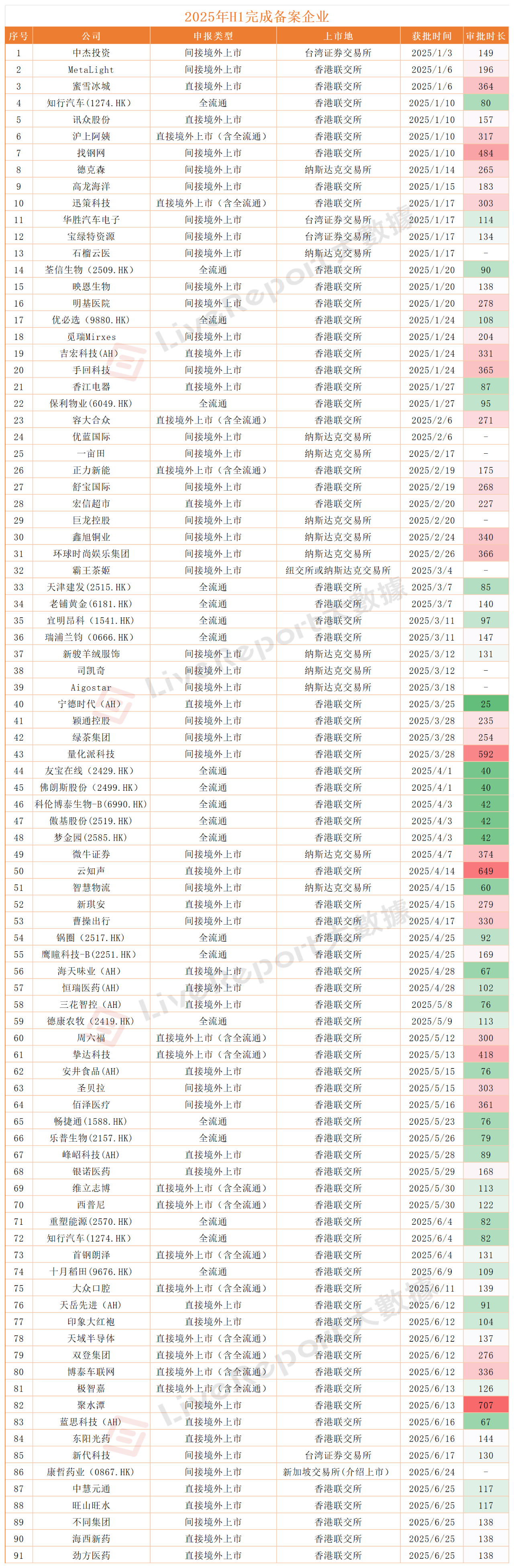 二、2025H1通过备案企业:91家,港股IPO平均耗时7.5个月