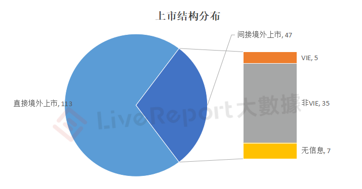 从上市结构来看,七成的申请IPO企业选择直接境外上市(H股),三成选择间接境外上市,其中有5家是VIE架构,35家为普通红筹架构。